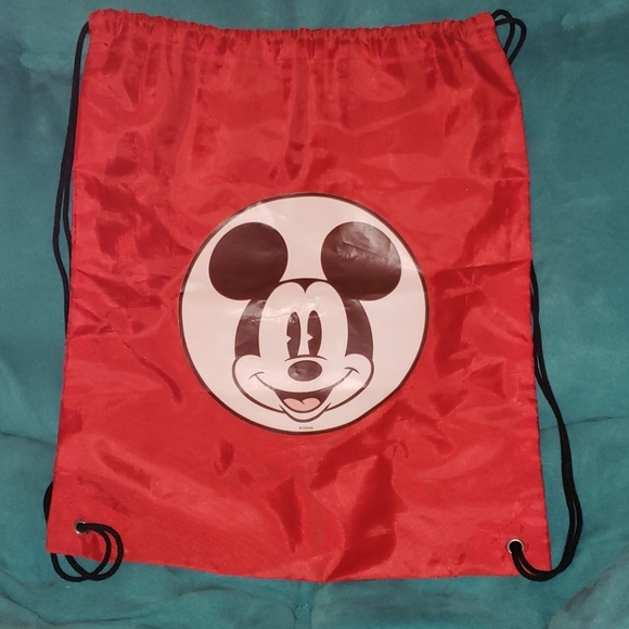 Screen printed Mickey Mouse face red drawstring bag. Drawstrings are black. Made of nylon. Good condition. Sampling of the screen printing is starting to occur.