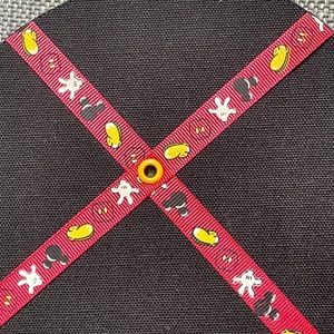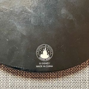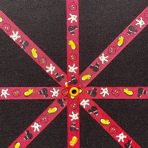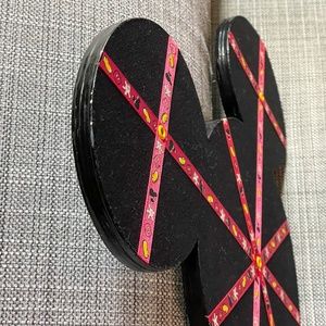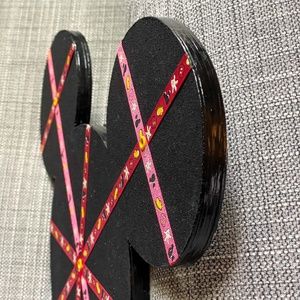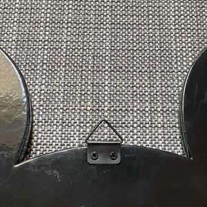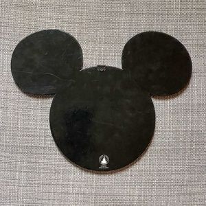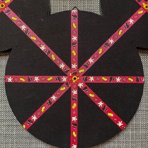 This listing is for a Mickey Mouse shaped memo board that is perfect for holding all of your Disney photos and memories! It was sold in Walt Disney World in the mid-2000s. It measures approximately 14"W x 11"H and is made of a light textured black board. Decorative red ribbon featuring icons of Mickey head, shoe, glove, and shorts criss-cross the board, allowing you to display photos, memos, papers, artwork, etc. Yellow grommets accent the points where the ribbons intersect. It has a triangular hook on the back, ready to hang in your home or office.