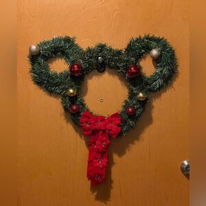 If you love Mickey Mouse, then you will love this Christmas wreath. Made of faux pine leaves with hanging sparkly red bows, and multicolored ornaments. The ears do sit back a little, but once you put it on your door it does straighten out. It is in excellent condition, and a perfect addition to your holiday decor.