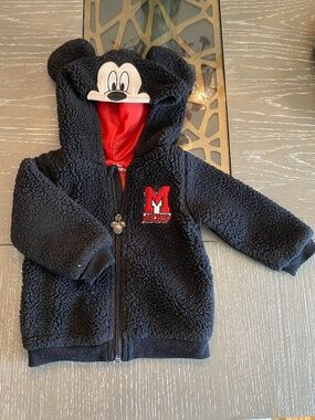 This Disney Mickey Mouse jacket is great for springtime. The outside of the jacket is “fuzzy” and the inside has a red lining. The hood is a Mickey head with ears.