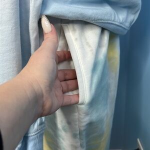 An embroidered Mickey Mouse offers a hand on these bold pants. The brushed back fleece fabrication features an allover iced dye tie-dye color scheme of teal and yellow that is sure to make these a warm favorite.