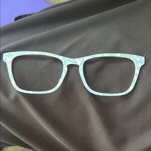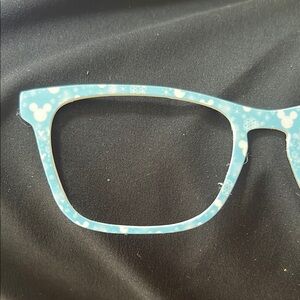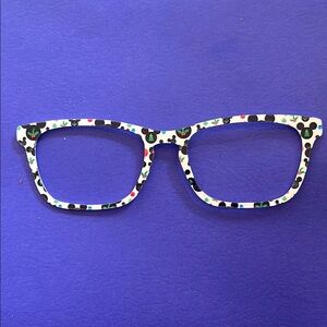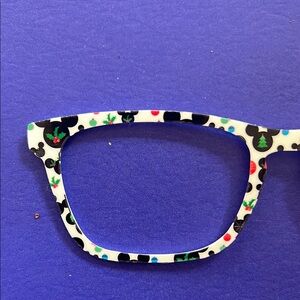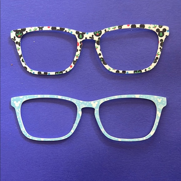 Set of two toppers compatible with pair eyewear casper frames. These are creator made with Mickey Mouse patterns. One frame is white with black and red accents and holly leaves for Christmas. The other is light blue with white accents and snowflakes. Both pairs for $15