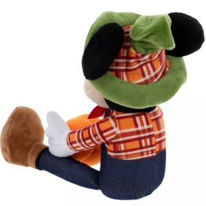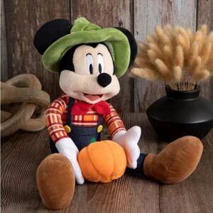 Add a touch of Disney to your fall display with this Mickey & Pumpkin Fall Shelf Sitter. This plush Mickey is wearing an adorable fall outfit that features a plaid shirt, denim overalls, and a green hat. He is holding a bright orange pumpkin in his hands to welcome fall in style. Dangle his legs over a shelf to create a charming scene!