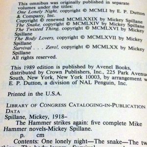 1989 Mickey Spillane 5 in 1 hardback. Contains five Spillane Stories. Good, clean used condition with some cover wear. The pages have slight yellowing around edges, see pictures. There is also a sale mark near the spine, see close up.