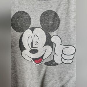 The grey sweatshirt featuring Mickey Mouse is a playful and cozy choice. Mickey Mouse in a classic pose, hands up and smiling.