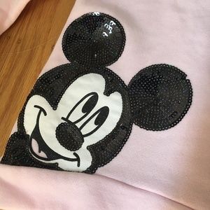 Like new. actually don't recall it ever being worn lol. pale pink. super soft and comfy. sequin graphics!