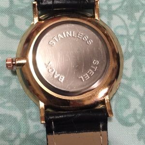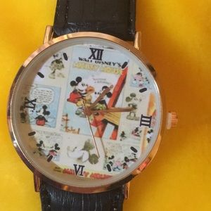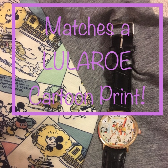 This artist ( by Artist “The One,” ) watch is of exceptional quality! The classic cartoon print (which I chose to purchase and bring to you here when I saw how well it matched the Lularoe print) The watch has a stunning ROSEGOLD finished face and it even has lovely ROSEGOLD hands! Roman numerals at the compass points to guide you and simple dots in between. Even the quality of the band is higher with this watch has double stitched crocodile stamped GENUINE LEATHER band . No branding apparent.