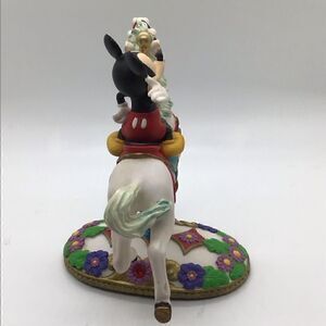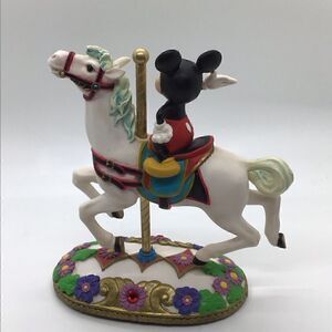 Cute Mickey Mouse on Carousel horse with floral and faux jeweled base. No chips or cracks, clean condition. There is a small scratch on the post as shown in photo.