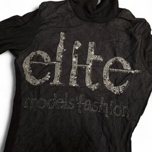 Serving early 2000s runway rebel. This black long-sleeve turtleneck features glittery "elite models fashion" text across the chest, layered cuffs + hem, and a sheer micro mesh base for that perfect peek-through moment.