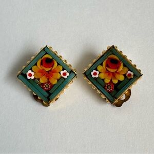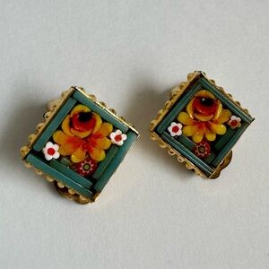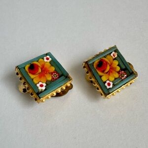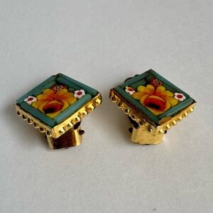 Micro Mosaic Floral Gold Green Clip On Earrings Vintage Romantic Italy Italian