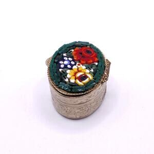 This exquisite vintage Italian micro mosaic pill box from the 1950s–1960s features intricate Millefiori floral mosaic work set into a beautifully gilded metal frame. The artistry showcases tiny hand-laid glass tesserae arranged into a delicate floral pattern—an iconic hallmark of traditional Italian micro mosaic craftsmanship.