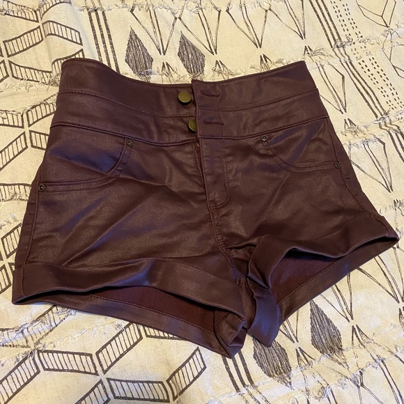 Wine / burgundy / dark colored, luxe coated, high waisted shorts. Vegan leather and surprisingly good quality.