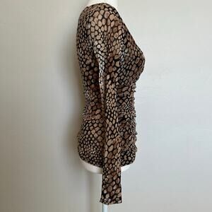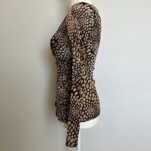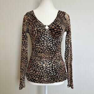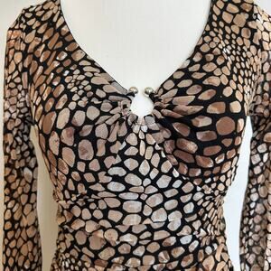 Micromesh brown and black long sleeve top with a silver ring detail in the middle of the bust and ruching on the sides