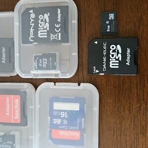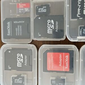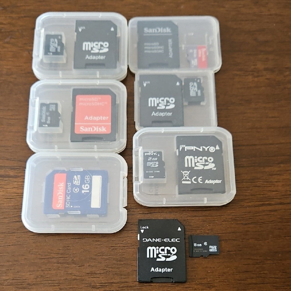 Bundle of MicroSD cards with adapters. Includes brands like SanDisk, PNY, and Dane-Elec. 3x 2GB, 2x 8GB, 1x 16GB, 1x 64GB