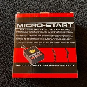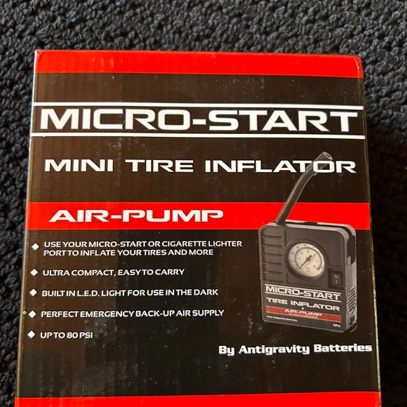 Compact and portable tire inflator. Features LED light for use in the dark. Supports up to 80 PSI.