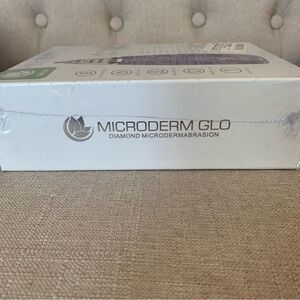 The product shown is the Microderm GLO Diamond Microdermabrasion System, a handheld device designed for at-home skincare treatments. It utilizes diamond exfoliation and suction technology to remove dead skin cells and improve skin texture.