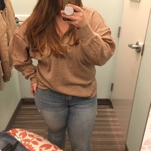 This top is RIDICULOUSLY comfy. I bought it oversized so it would fall off the shoulder paired with a cute bralette underneath. Finish off with a pair of dark high rise jeggings and a French tuck to make a SUPER cute outfit!