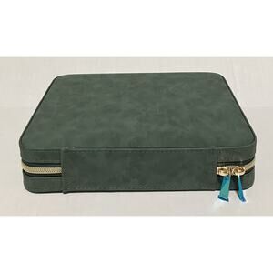 Microfiber Leather Travel Backgammon Set in green. Zip closure with wristlet for carrying. New without box. All pieces are present, with protective covers still on zipper pulls. Measures 7” X 9.5”. One indentation on back of case (see last photo); otherwise excellent condition. From non-smoking environment. Shipped USPS.