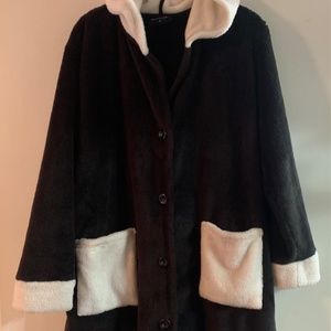 Indulge yourself in total comfort in this plush micro 100% polyester fabric jacket by SOFT & COZY CO. Sz. M but cut ample & could also be worn as a Large. Such easy care..washable. The Jacket is a nice length…from the shoulders to the bottom measures 34” and will hit right above the knee. Whether you run to the store or walk your dog you will feel so cozy like you are wrapped in a blanket.