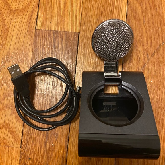 Blue brand microphone with UBS cord for computers and laptops. Great for video conferencing or podcasting. Can hang right on monitor.