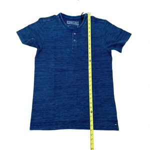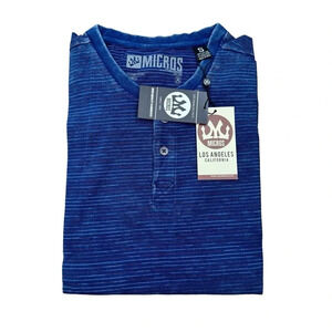 Micros Men’s striped Indigo T-shirt Top Tee Blue Short Sleeve Crew Neck, button closure