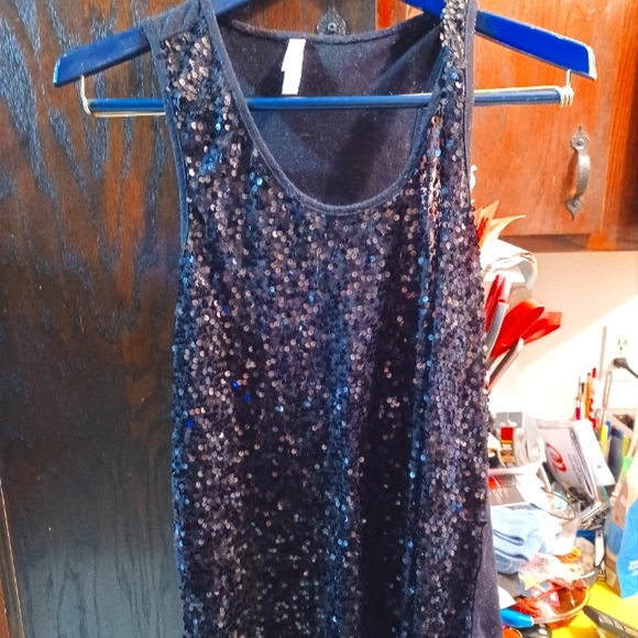 This is an amazing, retro, disco vibe tank top. Size XXL from Xhilaration it turns you into the disco ball. A black microsequined front with a plain black back you become the summer comfortable party! It's 28" long from the shoulders and 28" across the bust, 44" around the waist. The racer back style of this tank makes it great for the beach, the club, or a backyard BBQ.