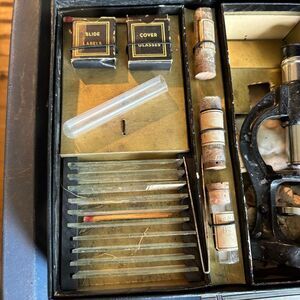 Microset Model 2MX With 125 Power Microscope. All the slides seem to be accounted for. There are some slide labels, the cover glass box is empty. The metal bowl is rusted. Set not in great condition. Instructions included.