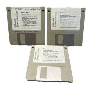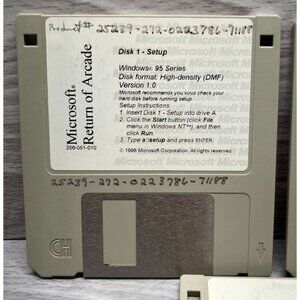This vintage Microsoft Return of Arcade floppy disk set is designed for Windows 95. It offers a nostalgic experience with classic arcade games. The disks provide an authentic computing experience for enthusiasts and collectors.