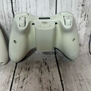 Microsoft Xbox 360 Wireless Controller White Set of 2 TESTED Genuine. The Controller on the right has Battery CORROSION but Still Works. The one on the left the inside sticker came off. Both could use additional CLEANING