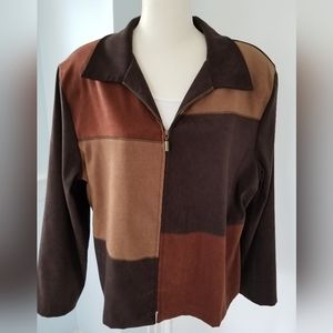 Great block pattern microsuede jacket. Excellent like new condition. No flaws at all. Size - Petite Large. Easy care, machine wash and dry. Colors - brown, tan and rust. Front full zipper. Has shoulder pads, easily removed if not wanted. Light weight and very comfortable. Very versatile. Great for casual or for business office.