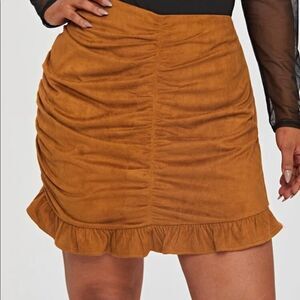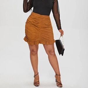 Ladies super cute camel colored faux microsuede Bodycon skirt with ruffled hem. New with tags. Please refer to size chart.