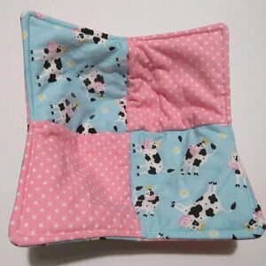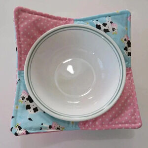 Chicken microwave bowl cozy. This cozy has cotton fabric made patchwork style with blue fabric with cows and pink and white polka dots.