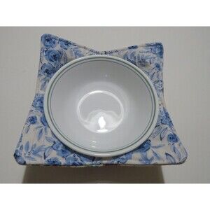 Microwave bowl cozy, reversible floral soup bowl or ice cream cozy. This cozy has cotton fabric with blue roses and garden flower fabric on the other side. You do not have to have a microwave. You can use the cozy when putting hot food in your bowl. The cozy will keep the food hot and keep your hands from getting too hot and it is easy to carry your food to the table. They can be used for ice cream to keep your hands warm and keep the ice cream cold longer. Protect your wooden furniture. These are reversible microwave safe bowl cozies. Nice for children to keep their hands from being burned or cold from ice cream. Wonderful gifts for college students, teacher gifts, Christmas gift, housewarming gift. Fits most cereal and soup bowls. The cozies are made from microwavable material, 100% cotton, 100% cotton thread and Wrap N Zap batting. Wash in cold water. Recommend to reshape them and set out to air dry. WARNING: Wrap-N-Zap is made of 100% Cotton fibers without any additives. It is not fire retardant or flame proof. For this reason, we suggest cooking in 1 minute intervals for a maximum of 8 minutes. Never leave the microwave unattended. Do not use in a Convection/Microwave oven.