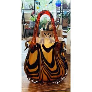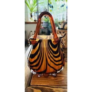 Mid 20th Century Hand Blown Art Glass Brown Black animal print Purse Applied handle