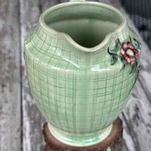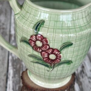 The past 70 years has been kind to this beautiful jug. There is a very tiny chip on the bottom rim, it truly does not hinder the beauty of the hand painted camellia flowers or the charm of the windowpane motif. Colors consist of a soft green background, brick red and blue flowers with darker green leaves. The mark on the bottom is smeared and unreadable. Many independent companies made these for export from Japan so it would be very difficult to determine which company made this jug. Measurements are 7” from handle to spout tip, 6” tall, and approximately 5” deep. Weight is 1 lb. Beautiful to use with a meal, for a sweet bouquet, or to display for admiring eyes! Thank you for looking!