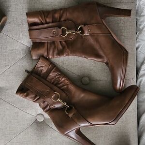 ๐ Mid Calf Brown Genuine Leather Coach Boots With Gold Accents Size 9 ๐