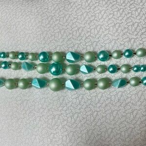 Mid Century 60's Aqua Blue Green Beaded Tri Strand Necklace Clip Earring Set