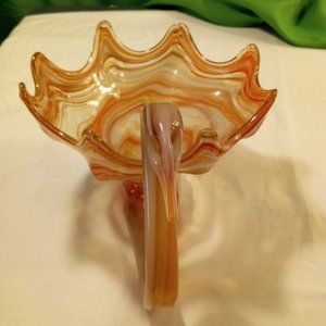 Mid Century blown glass in whites, copper's, cream, colors, it has some scratches see photo's, tip of beak is missing, measurements 10" diameter in bowl, 8.5" tall, 12" length, wear consistent with age, lovely work of art, can be used as candy dish, flowers bowl, Due to weight can not be bundled