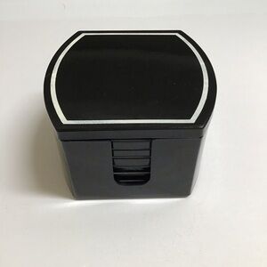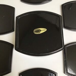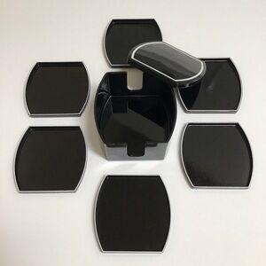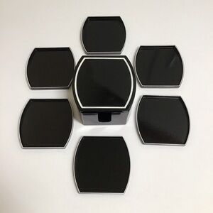 Benjamin & Medwin shiny Black Laquerware Coaster SET OF 6 with White Trim Japan Mid Century. Excellent vintage condition; minimal, if any, wear. Original tag on base. Six black lacquerware coasters in a matching lacquerware box with lid.
