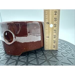 This Mid Century Ceramic Bowl Ashtray in brown with a drip glaze is a handmade piece of art pottery. The round ashtray features a unique design typical of Mid-Century Modern style and is made of ceramic. The unmarked brand adds to its authenticity as an original piece from a specific country or region of manufacture is not known. Perfect for adding a touch of vintage charm to any space, this ashtray is a functional and stylish addition to any collection.