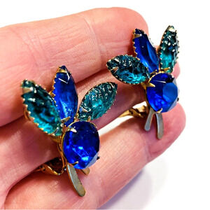 Mid Century Clip On Earrings - vintage 1950's jewelry done in a classic goldtone fan shaped setting covered with royal blue and carved green rhinestones. No hallmarks but these are nice quality vintage fashion jewelry. Wonderful colors - these will draw attention whenever you wear them! In excellent vintage condition - minor surface wear - no significant damage or flaws - just stunning!