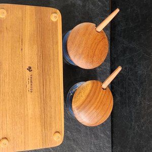 A mid century Danish modern 1969 teak condiment set with Trey and spoons. This set is perfect for so many items. Jam jellies, sugar, ice cream toppings, relish, mustard, Etc. The clear glass bowls are accented with a simple, blue, thin band of color. And in the middle are three blue pedal accented with three gold dots. The MCM piece is in excellent condition, looking like new. Measures 10 inches in length. Tray length. by 3.5 inches high with bowls on the tray. Bowls are 2 1/4 inch tall. 4 inch round. Non smoking pet free home. @ ER NW Boxed