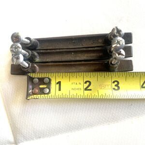 This set of 3 vintage bronze tone brass drawer pulls is perfect for adding a touch of mid-century style to your drawers.. Made from brass, these drawer pulls are not only stylish but also have a nostalgic quality to them, adding a unique vintage touch to your decorative hardware. Upgrade your drawers with these elegant and timeless handles.