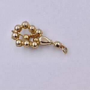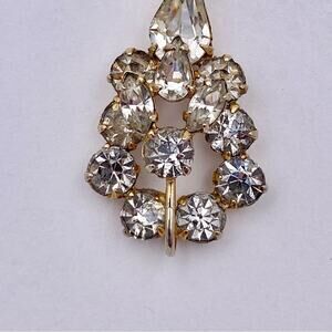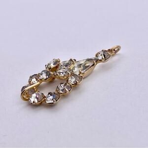 This Mid Century vintage gold tone fancy pendant features a drop design of prong set round sparkling rhinestones and a teardrop rhinestone accent.