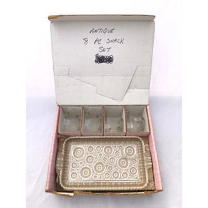 Entertain in style. Just the four of you. Eight piece glass set. Four sandwich/snack trays and four teacups. Each tray has a small indentation to hold a cup. Cup holds 4 oz. Snack tray measures about 11 x 6. Scallop and circle design. Includes the original box.