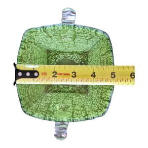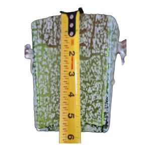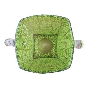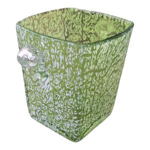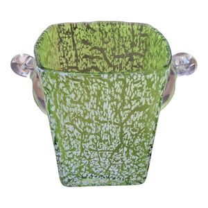 Small green art glass ice bucket with clear glass handles.  Could serve as a vase or bowl.  Square shaped, Textured white crackling splash allover application.  Weighs 2 lbs 4 ounces ; approx. 5.75" tall; 5" wide across the top (pictured).  No chips, no cracks.