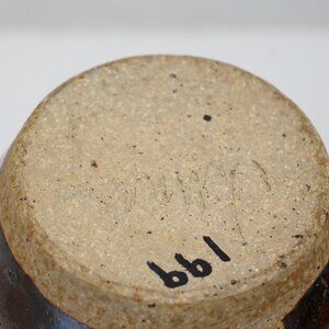 Mid Century Modern Clay Pottery Three Tone Minimalist Short Pitcher Vase sign James. 7" x 3" (mouth). This is a hand made brown, grey, a off white three tone slant stripe clay glazed vase that has a mid century rustic style.