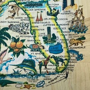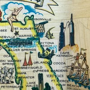 The graphic includes all the things that Florida is known for: palm trees, flamingos, hibiscus flowers, retro sunbathers, characters painted surfing, tandem surfing and in bathing suits, etc. All the sites are on here too! Disneyworld, Tampa, Cape Kennedy, Key West, etc. etc.