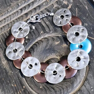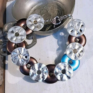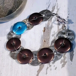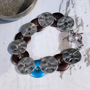 Mid Century Modern Style Handcrafted Silver Blue Brown Satin Disc Beads Bracelet