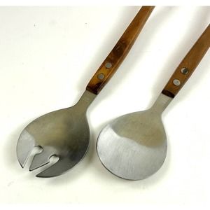 These beautiful utensils with brown teak wood handles and stainless steel are the perfect companions for your salad-preparing endeavors. Delight your guests and add a touch of vintage elegance to your table setting with this fantastic set in very good condition.